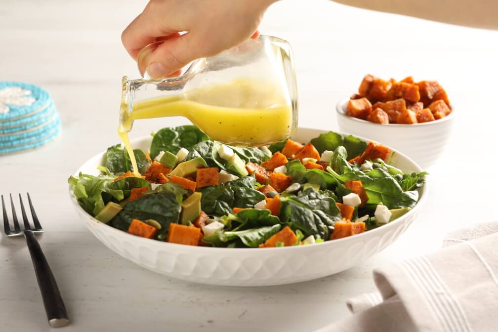 - Place greens in a large bowl. Add cheese, pepitas, avocado and roasted sweetpotato cubes.