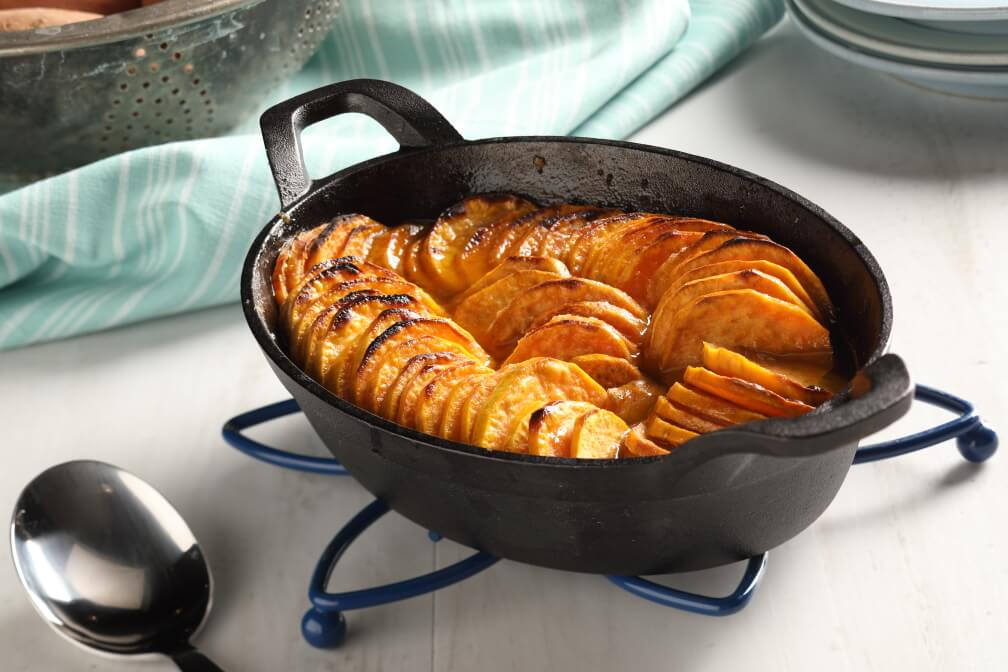 - Peel and thinly slice sweetpotatoes. Arrange in a casserole dish.