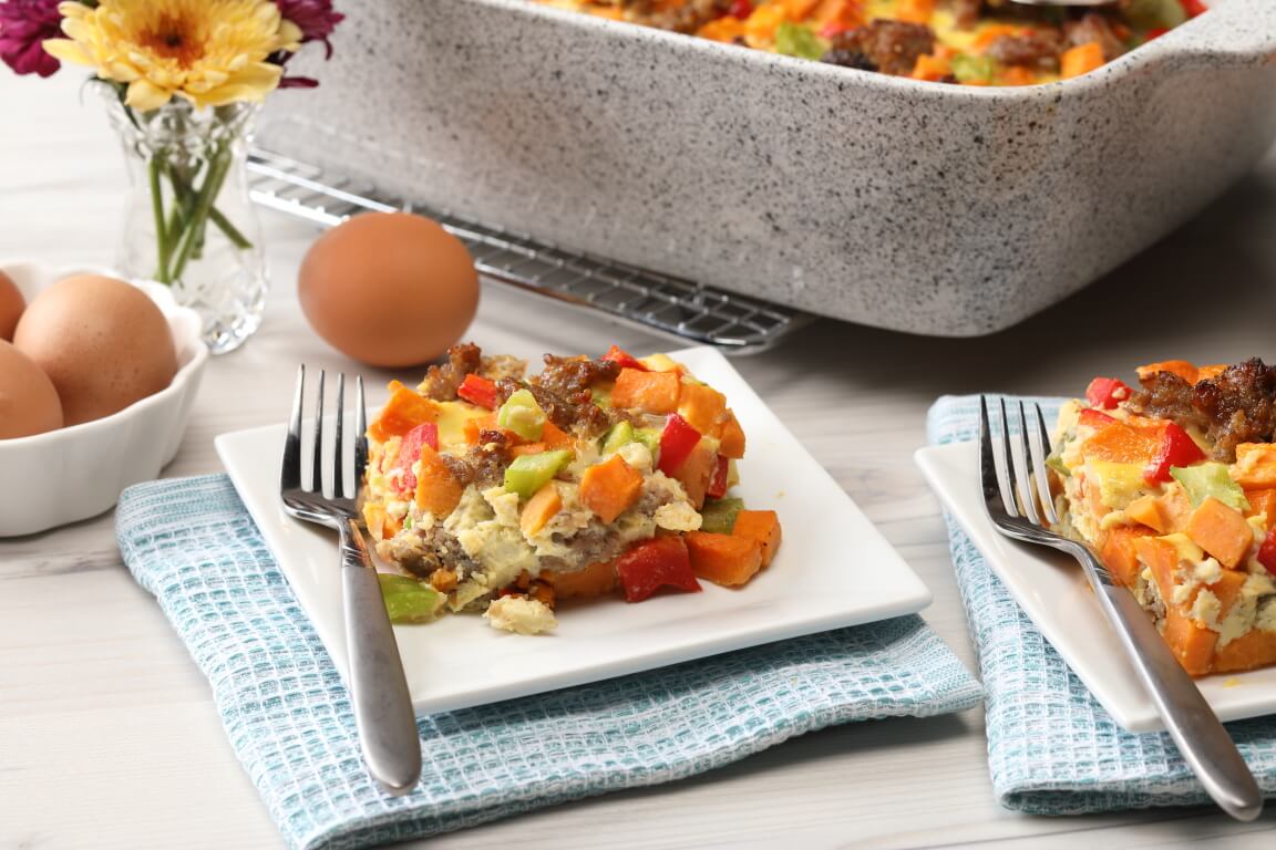 - Combine: sausage, sweetpotatoes, and peppers, and pour evenly into a 9×13 baking dish.