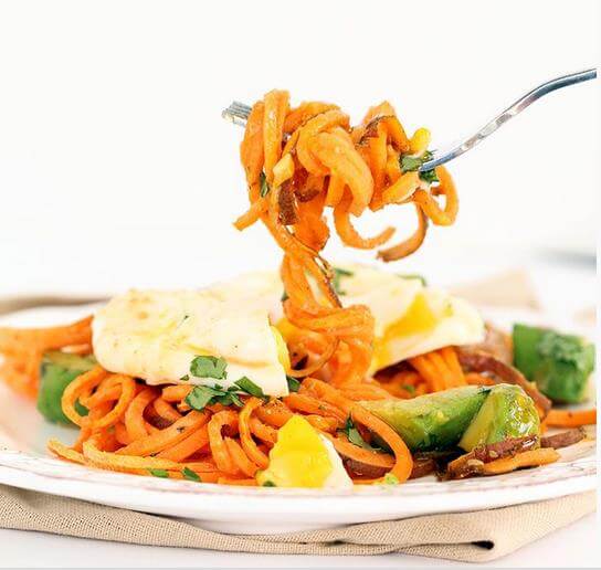 Spiralized Eggs Benedict Sweetpotato Noodles by Inspiralized – Breakfast is no new territory for sweet taters. Sweetpotato hash, classic. Sweetpotato noodles? Deeeeeliciously unique. Slice some avocado, eggs and a touch of spice – boom, breakfast home run!