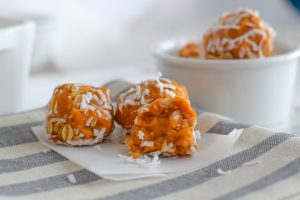 When ready to enjoy, sweetpotatoes provide an impressive package of nutrition. One medium sweetpotato delivers 4 grams fiber, 120% the Daily Value for vitamin A and 30% the Daily Value for vitamin C – all for 100 calories! To add more sweetpotatoes to your weekly menus, simply use anywhere you’d use pumpkin, like in smoothies, muffins or in this satisfying recipe for No-Bake Sweetpotato Coconut Ginger Energy Bites.