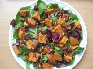 It’s easy to put together a delish dish, without breaking the bank on exotic ingredients. And you don’t have to be a master chef either. As a matter of fact, most cooks that I know would prefer to keep it simple in the kitchen. But that doesn’t mean that you have to sacrifice flavor. Take a look at this Sweetpotato Salad. It only takes a few minutes, but wow does it pack a lot of flavor…Pistachios add a little crunch, cherries add a hint of tartness to balance the natural sweetness of the main ingredient, spring greens add a hint of bitterness and a balsamic vinaigrette rounds everything out. But here’s the most important part – the sweetpotatoes are allowed to shine. No syrupy sauce or gooey marshmallow topping needed here, thank you very much.