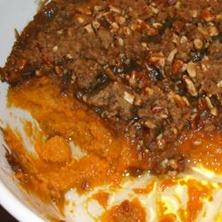 2. Combine the mashed sweetpotatoes with the white sugar, soft butter or margarine, beaten eggs, vanilla and milk. Spoon into a 2 quart oven proof baking dish.