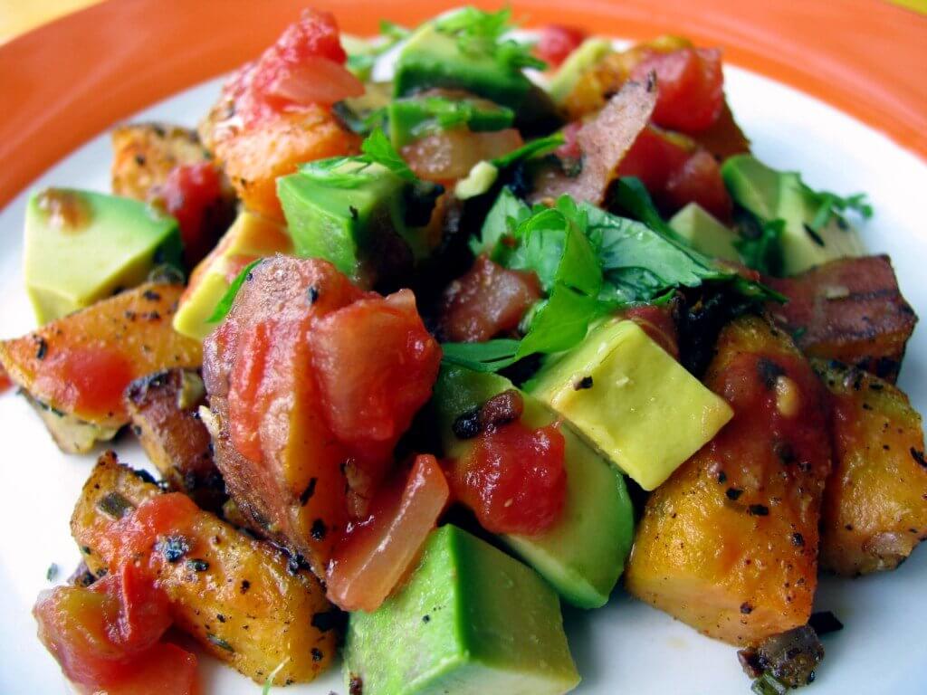 Microwave Sweet potatoes until almost done. Cut into cubes and set aside. In a frying pan, sweat onion with a little olive oil until tender. Add Sweet potatoes, garlic, bell peppers, and spices. Cook until potatoes are lightly browned and are tender. Add Tomatoes. Toss for 30 seconds and remove from heat. Toss mixture with avocados, squirt with fresh lime, and garnish with cilantro.