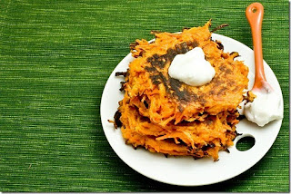 To keep the traditions alive, add sour cream or applesauce on the side of the sweetpotato latkes for extra flavor. Also, for a lighter version, you can try baking the latkes to reduce the amount of grease.