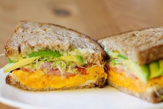 Nectar, a juice bar in Brooklyn, uses mash instead of slices – also a good option. Sweetpotato mash, avocado, sprouts, onion and jack cheese.This sandwich from the blog Diana Takes A Bite was an entry in a sweetpotato recipe contest