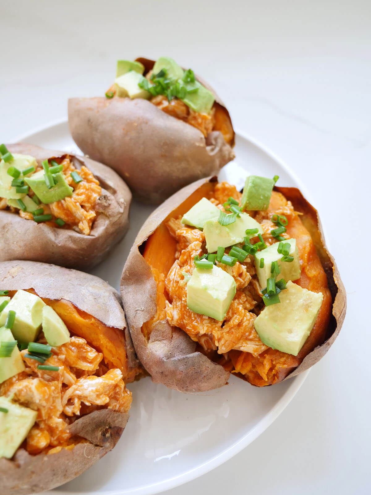 Buffalo Chicken Stuffed Sweetpotatoes are a bold and satisfying twist on a classic flavor combo. Tender baked sweetpotatoes are filled with saucy shredded buffalo chicken and topped with creamy avocado and fresh chives for a balanced meal that’s perfect for lunch or dinner.Recipe created by Mia Syn