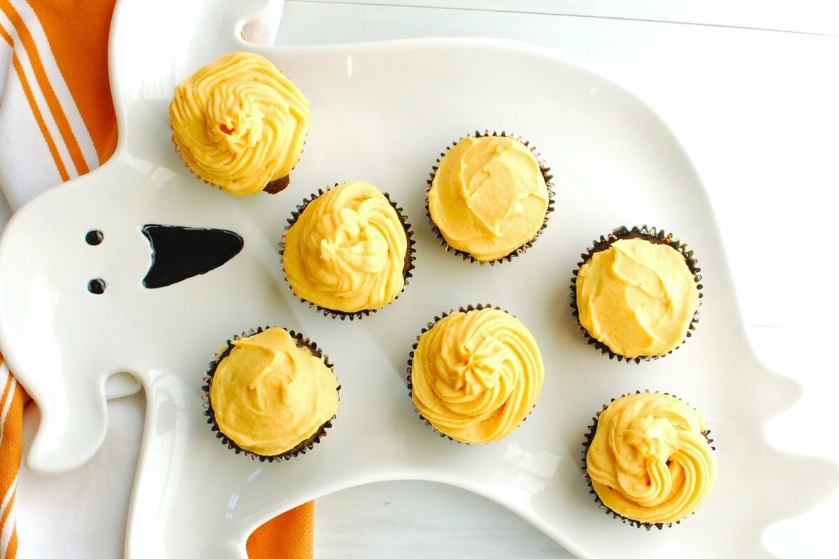 Recipe created by Chrissy Carroll, RD from Snacking in SneakersThese Halloween sweetpotato cupcakes are a balanced sweet treat that have less sugar than most traditional cupcake recipes. Sweetpotato is used in both the chocolate cupcake and the frosting!