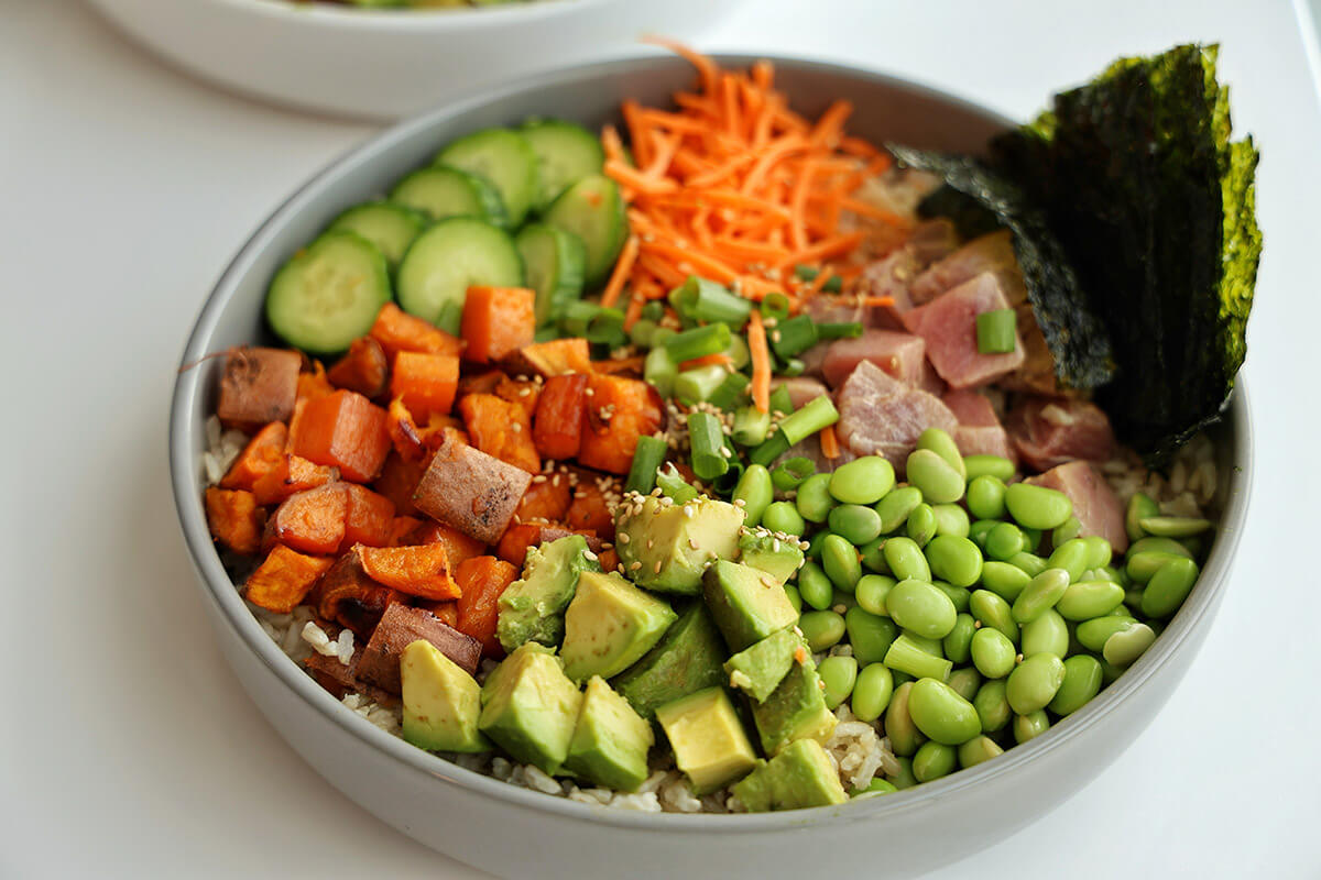 - To assemble the bowls, evenly divide brown rice, marinated tuna, roasted sweetpotatoes, edamame, carrots, avocados, and green onions among four bowls.