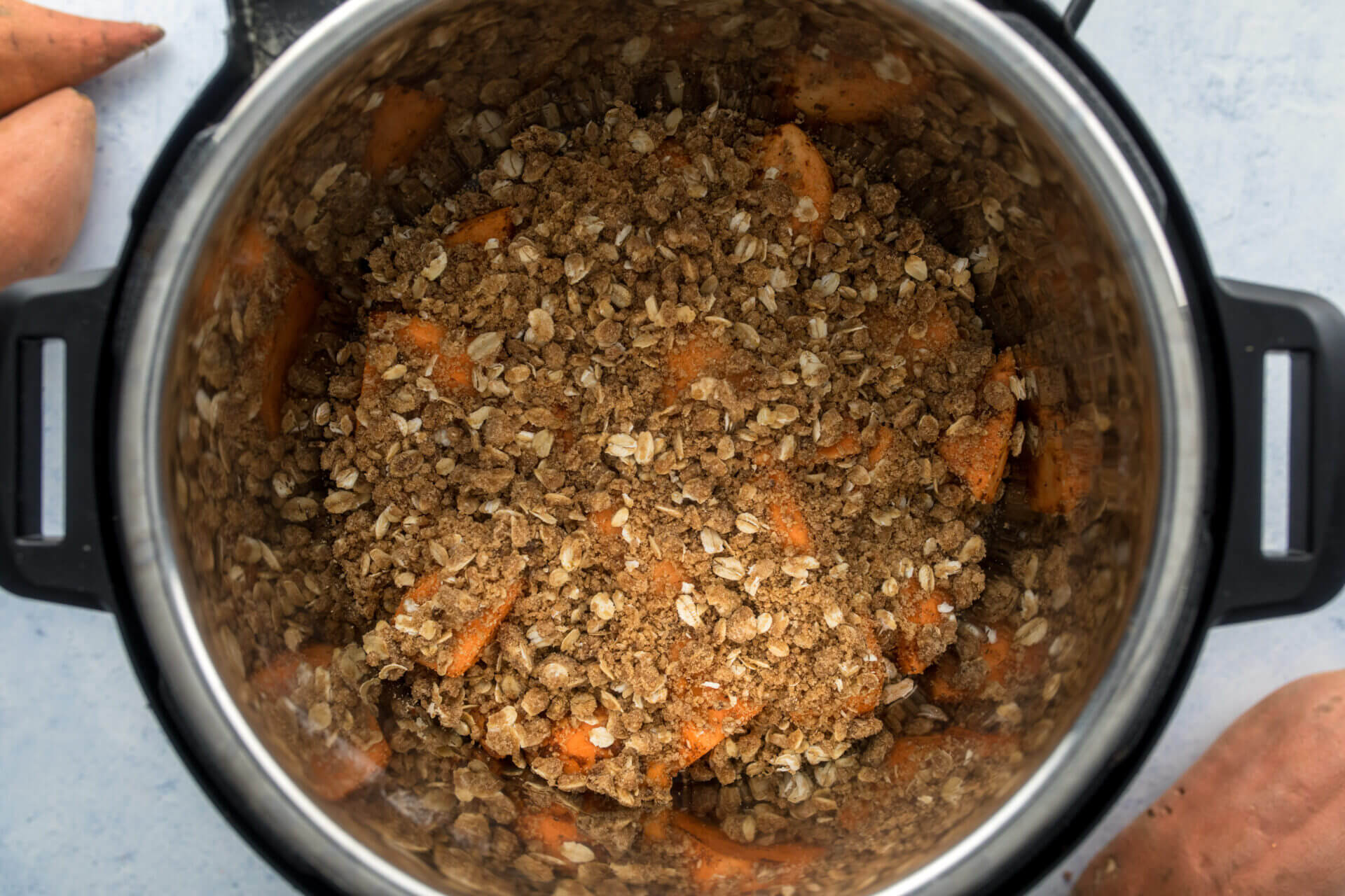 - To the instant pot, sprinkle crisp topping evenly over sweetpotato filling.