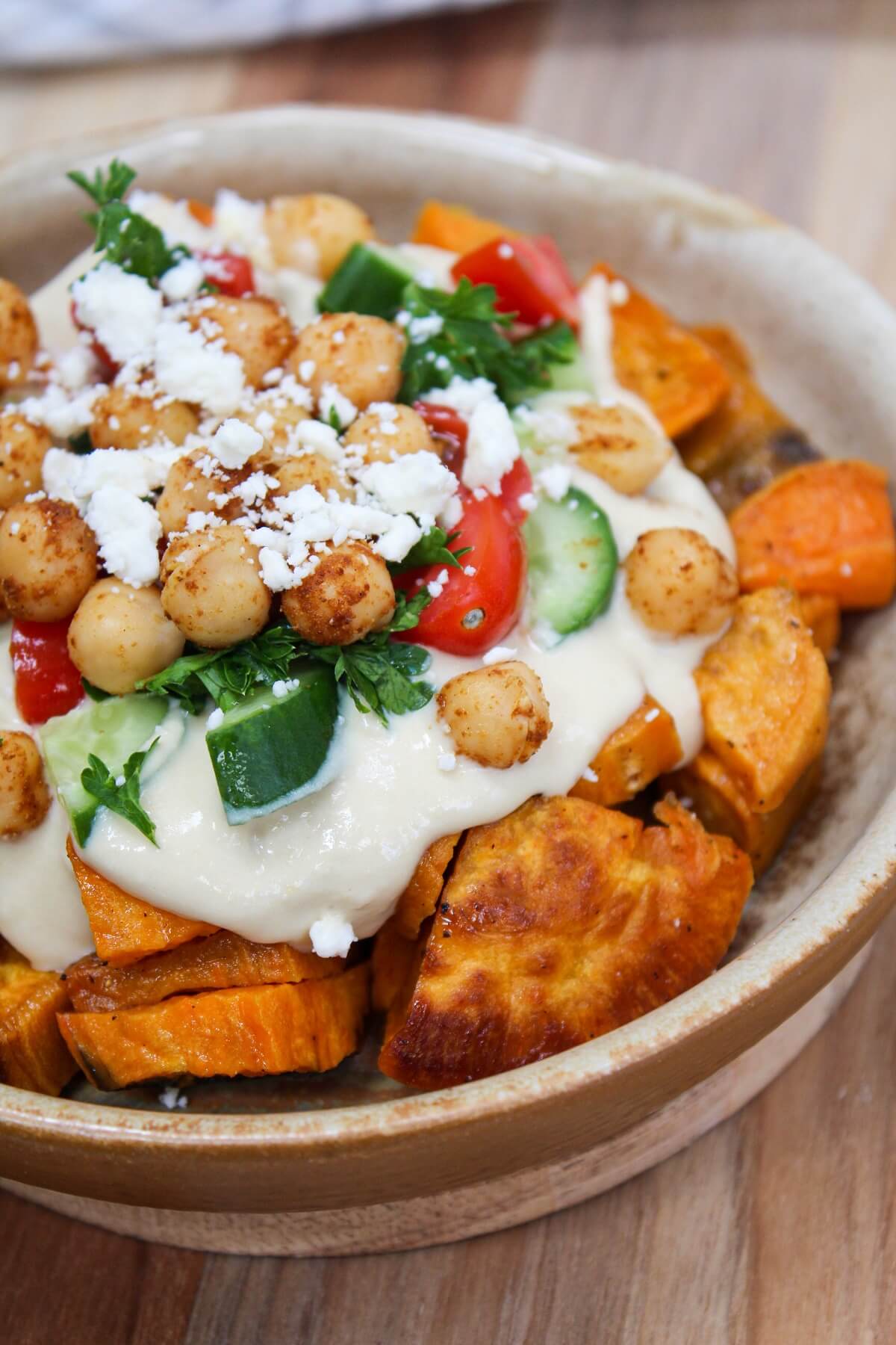 - Once sweetpotatoes have finished roasted, remove them from the oven. Divide sweetpotatoes evenly between 4 bowls. Top with citrus hummus, cucumber, tomatoes, parsley, crispy chickpeas, and crumbled feta cheese.