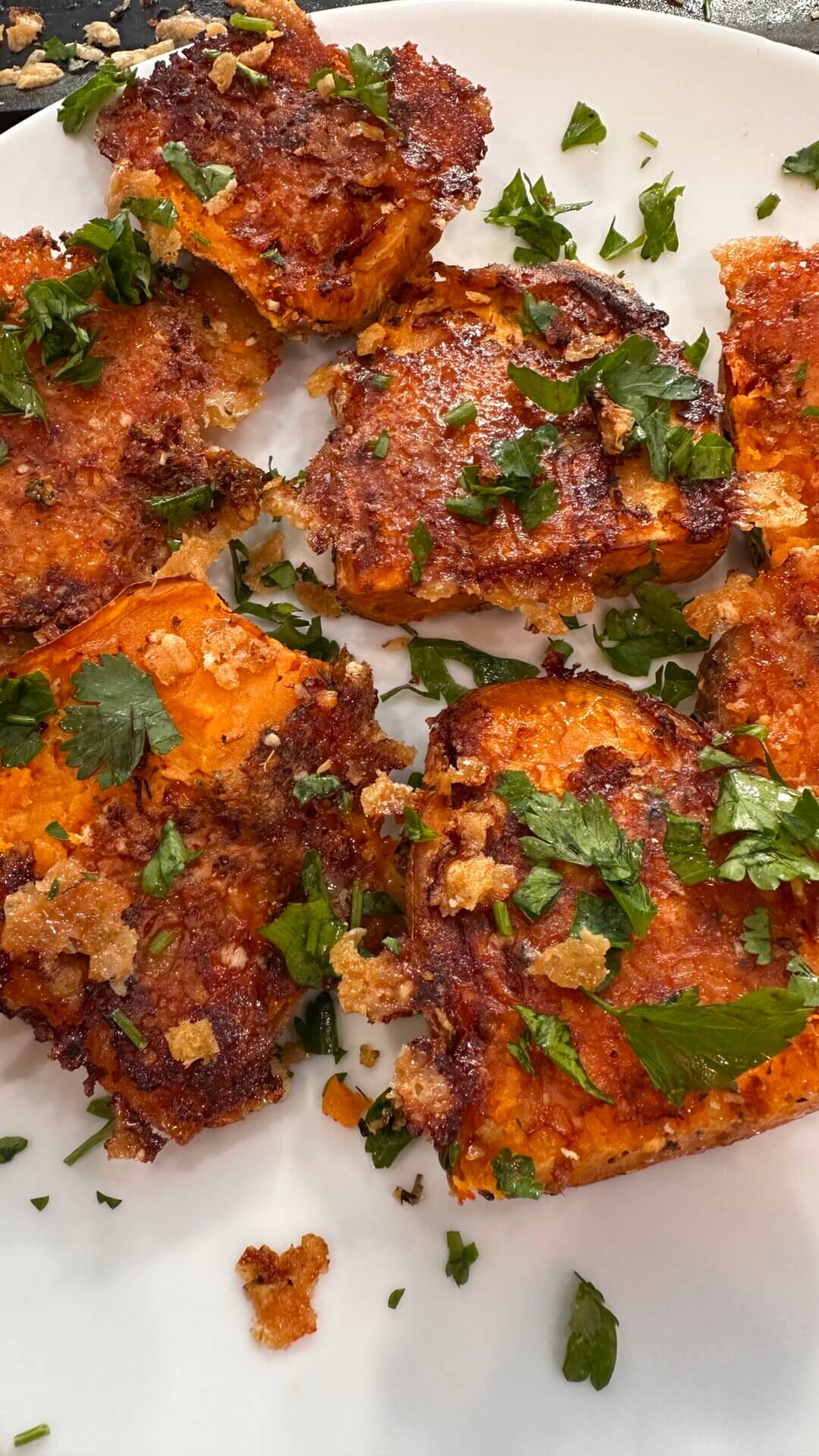 - Slice your North Carolina sweetpotatoes lengthwise and place in a bowl with the olive oil, Italian seasoning and garlic. Mix well until the sweetpotatoes are well coated. Sprinkle shredded parmesan cheese onto your baking sheet and spread so it’s evenly coated. Place sweetpotatoes cut-side down on top of the parmesan, bake for 30-40 minutes until sweetpotatoes are tender and the bottom layer of cheese is crispy and deeply browned. Remove, let cool and serve topped with herbs, like parsley!