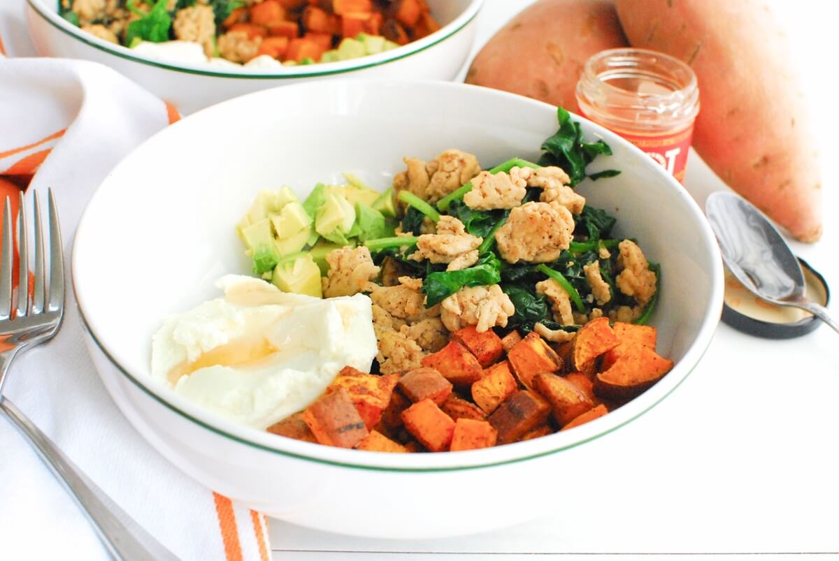 If you’re preparing one bowl at a time (instead of prepping all the bowls at once), each bowl should have about ⅓ cup ricotta, ¼ of the avocado, 1 tsp hot honey, and then a big scoop of chicken/spinach and a big scoop of sweetpotatoes.