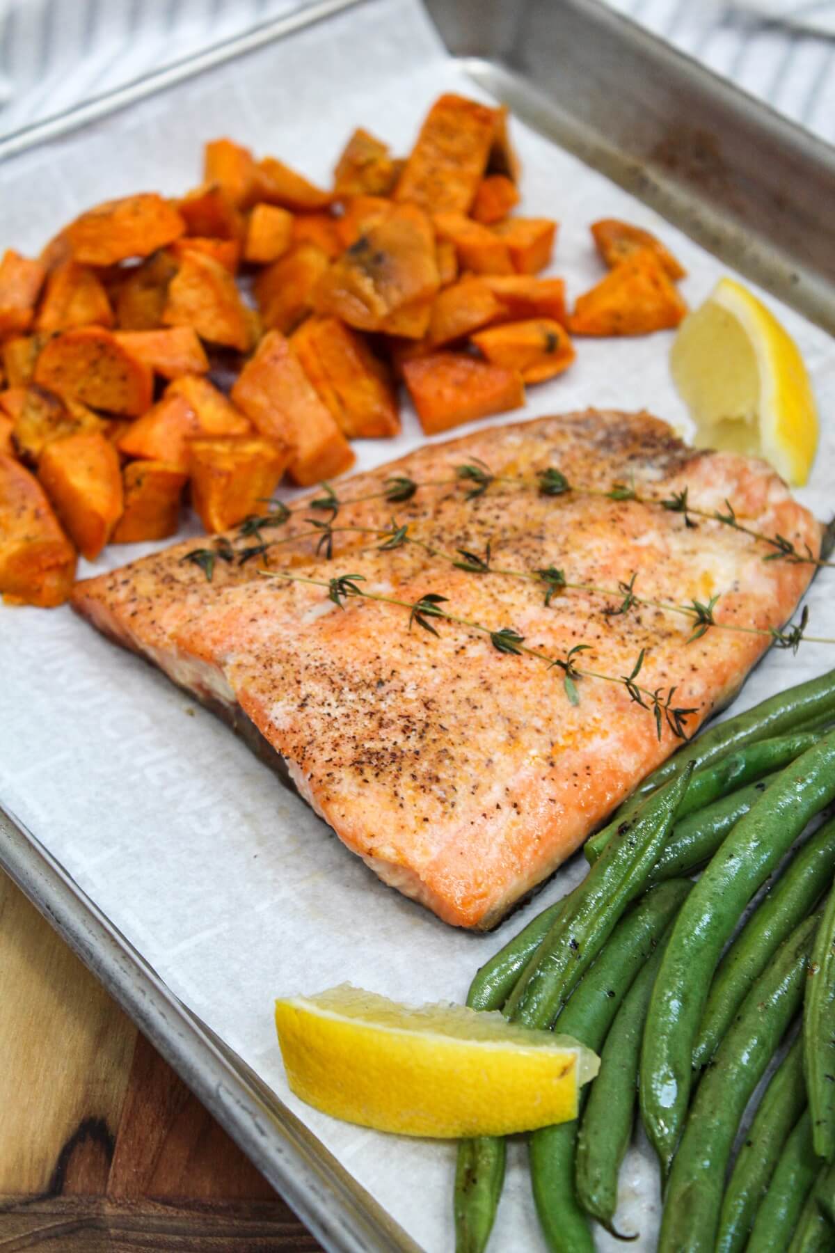 - Bake sweetpotatoes and green beans for 10 minutes. While veggies cook, prepare the salmon. Season with salt and pepper and rub with remaining olive oil. Garnish with fresh thyme.