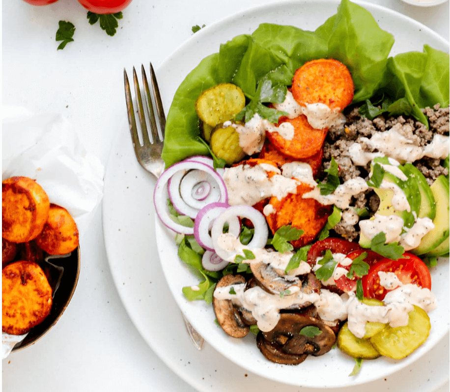 Recipe Developed by Abra Pappa MS, CNS, LDNThis burger bowl recipe comes with the versatility to appeal to those in need of a healthy solo meal, but it's also become a family favorite. It features lean ground beef and savory cremini mushrooms, paired with perfectly spiced sweet potato rounds, fresh lettuce, avocado, and crunchy pickles. With the option to set up a salad bar, the kids can mix things up by adding their favorite toppings. Top it all off with a creamy, tangy secret burger sauce, and you’ve got a delicious, nutrient-packed sweet potato burger bowl everyone will love!