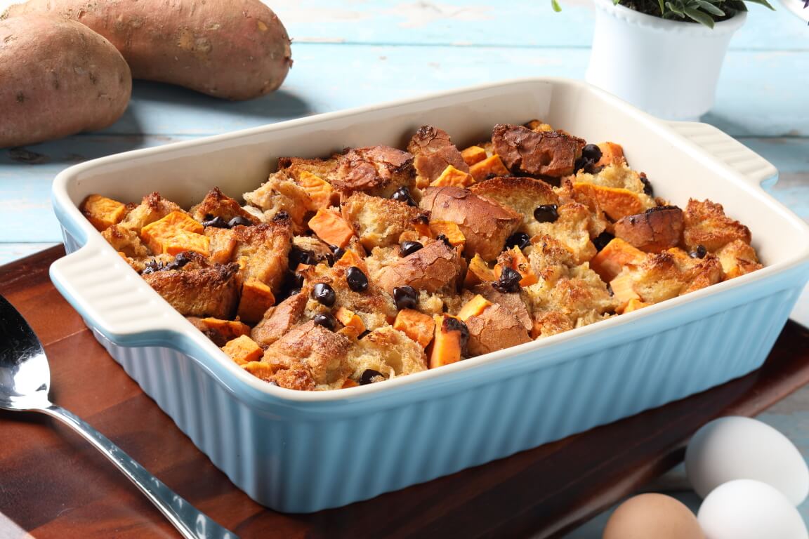Recipe Developed by Tessa Nguyen, RD, LDN in Partnership with NCSPC Revamped bread pudding with bites of sweetpotato and hints of dark chocolate chips make for a custardy, light dessert that’s budget-wise and slow-cooker friendly.