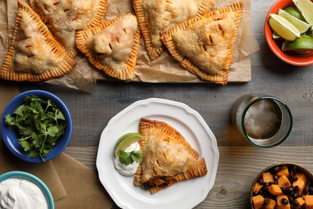 - Prepare a baking sheet with parchment paper or cooking spray. Roll out each half of the pie pastry to an 11-inch round (or unroll prepared pastry round and cut it into 6 triangles. Divide the sweetpotato mixture and the remaining Cheddar cheese onto 6 of the triangles. Moisten the edges of the triangles; top each with one of the remaining 6 triangles. Crimp the edges together with a fork; cut a steam vent in each pastry.