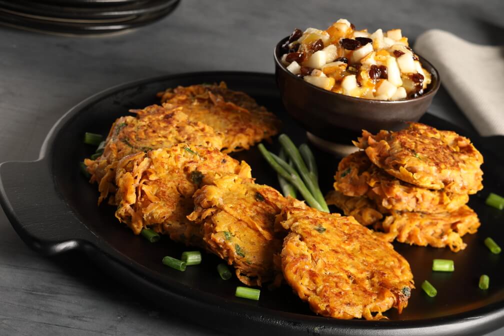 Sweetpotato Fritters with Pear Coulis feature crispy pan-fried fritters made from shredded sweetpotatoes, eggs, green onions, and warm spices. Served with a sweet pear coulis blended with raisins, orange marmalade, and ginger, this dish balances savory fritters with a bright, fruity topping.