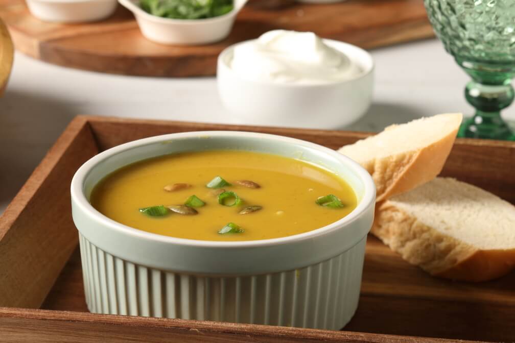 Sweetpotato Poblano Soup is a rich and flavorful blend of sweetpotatoes, poblano peppers, coconut milk, and warm spices. Creamy with a gentle heat and finished with fresh cilantro, green onion, and crème fraîche, this vibrant soup is both comforting and bold.Created exclusively for NC Sweetpotato Commission by Limone’s Mexican Restaurant in Asheville, NC