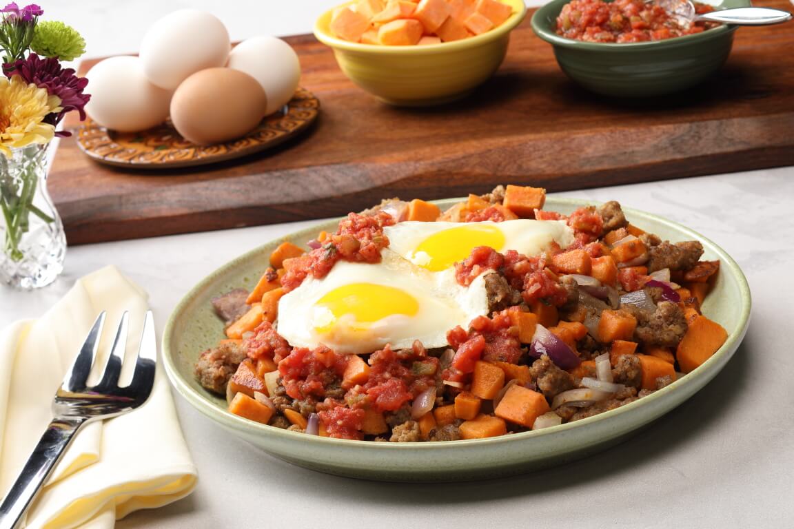 This Sweetpotato and Sausage Hash is a hearty protein-packed one-skillet meal that combines savory ground sausage with tender, spiced sweetpotatoes and sweet onions. Topped with melty sharp cheddar, perfectly cooked eggs, and finished with salsa, it’s a satisfying breakfast or brunch dish with bold flavor and comforting texture.