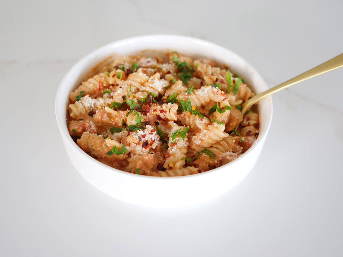 Sweetpotato Cottage Cheese Pasta, created by Mia Syn, features roasted sweetpotatoes blended with pasta sauce and cottage cheese for a creamy, protein-packed twist on classic pasta. Tossed with hearty sausage and fusilli, this comforting dish is rich and filling.