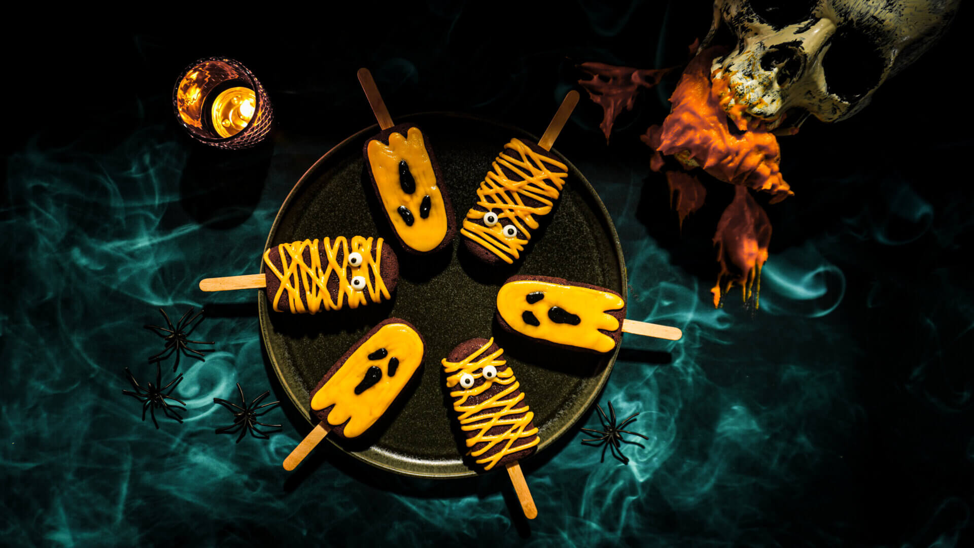 - Remove the lollypop brownies, and with the sweetpotato icing, pipe strips across each brownie at random angles and affix two confectionery eyes to each brownie before serving.