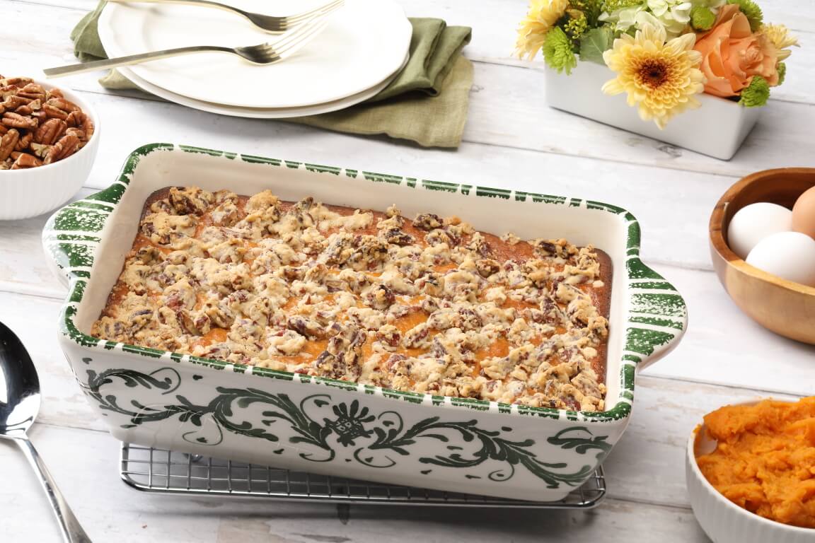 Sweetpotato Pudding is a rich, holiday-style dessert made with creamy mashed sweetpotatoes, eggs, butter, and sweetened condensed milk. Topped with a buttery pecan and brown sugar crumble, it bakes into a warm, comforting dish with a soft, custard-like base and crisp topping.This festive holiday pudding shared with us by ncegg.org