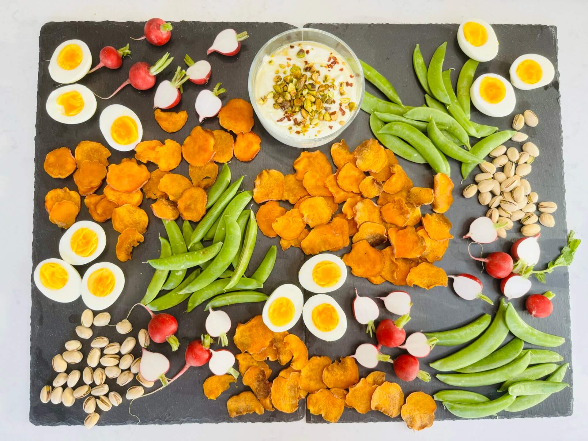 - - Arrange the sweetpotato chips, peapods, radishes, and hard-boiled eggs around the dip.
