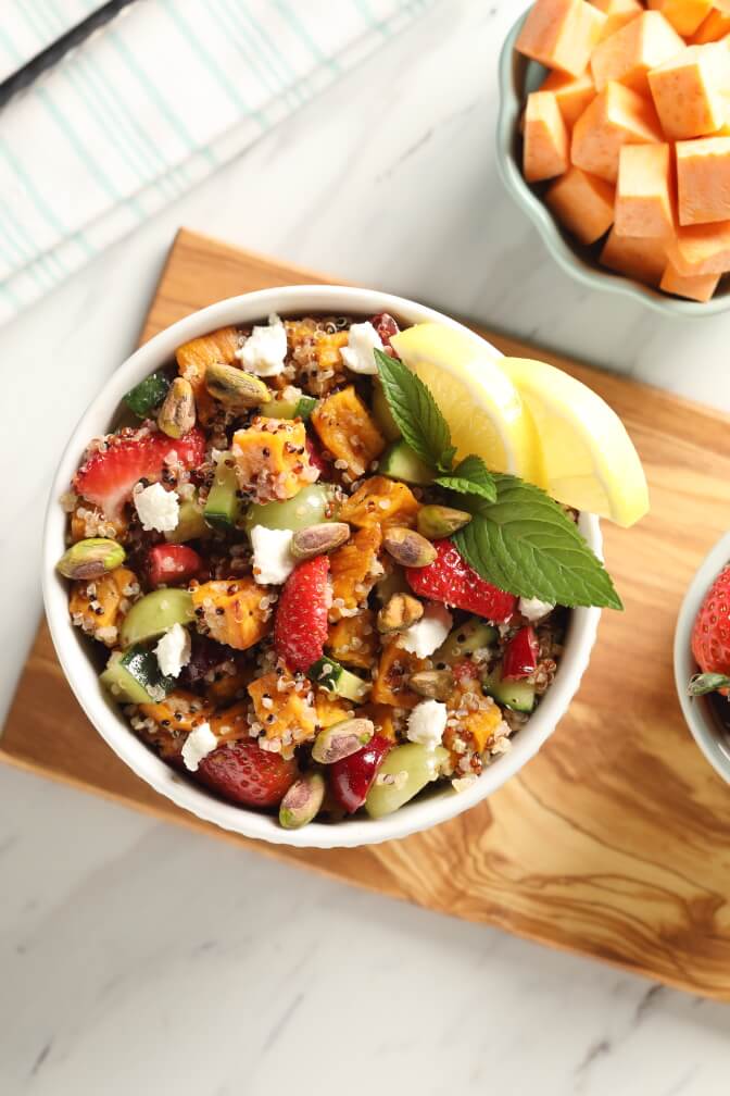 - When quinoa is done cooking, add quinoa to the bowl. When sweetpotatoes are done roasting, add them to the bowl as well.
