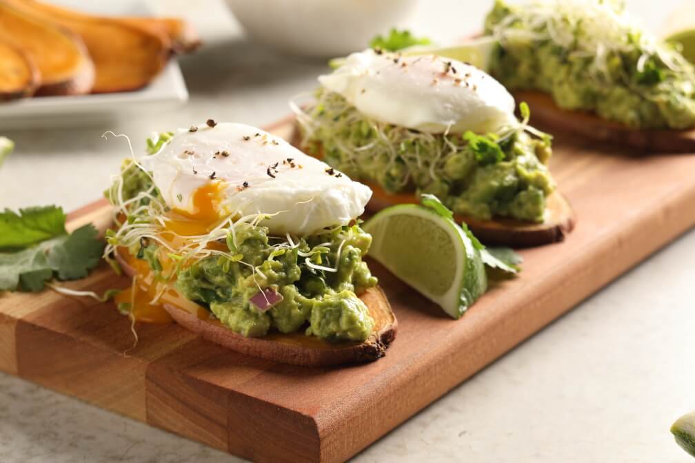 - TOP sweet potato toasts with guacamole and alfalfa sprouts. Top with poached eggs. Sprinkle with salt and pepper.