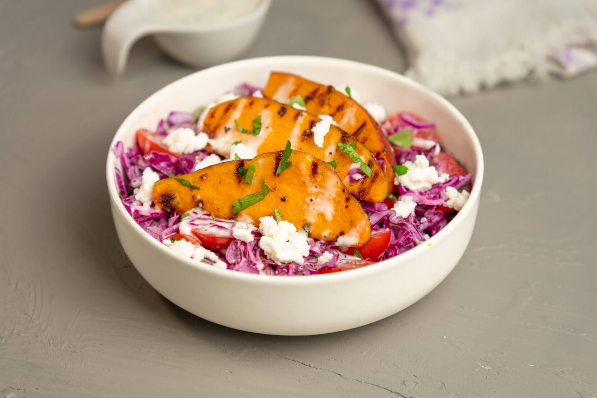 - To serve, place sweetpotato wedges on a bed of dressed cabbage and drizzle with the remaining poppyseed dressing, and sprinkle with cheese.3 tbsp feta cheese