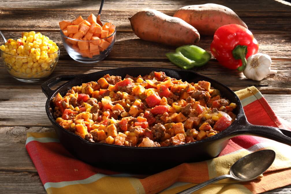 Tex Mex Sweetpotato Beef Skillet is a hearty one-pan meal featuring lean ground beef, diced sweetpotatoes, bell peppers, corn, and tomatoes simmered together with Southwestern spices. The result is a flavorful, comforting dish with a balance of savory, sweet, and smoky flavors that can be enjoyed on its own or served over rice. Created by: Meredith Bernard: This Farm Wife for the North Carolina SweetPotato Commission