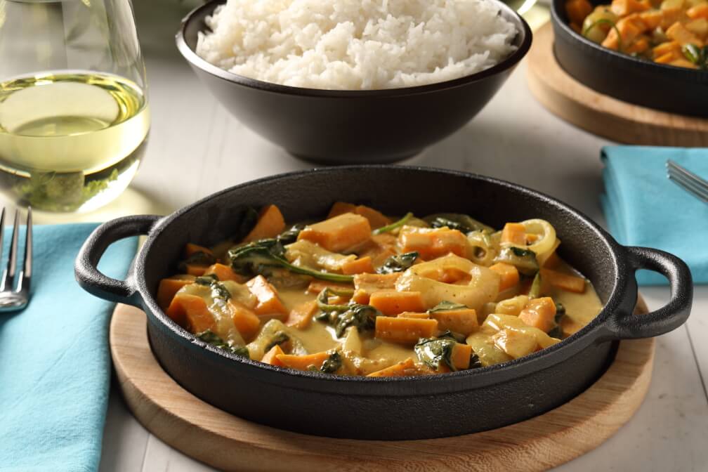 Thai Sweetpotato Curry combines tender sweetpotatoes, spinach, and onions simmered in a creamy coconut milk sauce flavored with yellow curry paste and almond butter. This comforting dish delivers a rich balance of sweet, savory, and mildly spicy flavors and can be served over rice with peanuts and fresh cilantro for garnish.