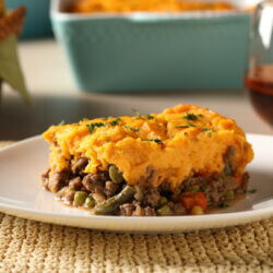 Add the beef mixture to a 9x13 casserole dish. Top with shredded cheese. Spread the sweetpotatoes over the beef mixture. Top with dried parsley. Bake uncovered for 30 minutes. Remove from the oven and allow the shepherd’s pie to rest for about 5 minutes. Serve.