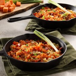 Push the sweetpotato rice mixture to one side of the skillet and raise the heat a tad. Add a small drizzle of oil or cooking spray to the other side of the skillet and add the whisked eggs. Scramble until cooked through (about 2 to 3 minutes).