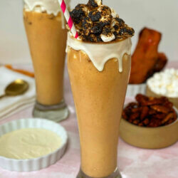 It’s officially summer, and a luscious, fully loaded milkshake is always a good idea on hot summer days and breezy summer nights! Summer means it’s time to start enjoying ice cream, toasting marshmallows, and nostalgica, fun desserts like this Candied Sweetpotato Milkshake! This sweet treat is made with a base of creamy candied sweetpotatoes that are coated with brown sugar and roasted until they’re sweet, sticky, and caramelized. Also added to the mix is nutty and luscious butter pecan ice cream, decadent maple syrup, and more. Top this fun summer dessert off with a white chocolate shell rim coated in homemade candied pecans and a dramatically heaping mound of mini marshmallows just begging to be toasted into nutty, melty goodness! If you’ve been waiting for a sign to order the kitchen torch, consider this to be it! This Candied Sweetpotato Milkshake is the perfect way for everyone to enjoy the beauty of endless summer days and nights.