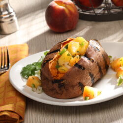 Make an incision into middle of potato, generously spoon Peach Cilantro Salsa into center.