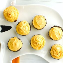 When the white chocolate is melted, stir in the yogurt and ¾ cup of sweetpotato puree. Place in the fridge for an hour while you continue to wait for the cupcakes to cool.