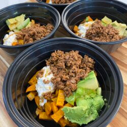 Build your bowl with sweetpotato, taco beef, cottage cheese and fresh avocado. Finish it off with a drizzle of hot honey and enjoy!