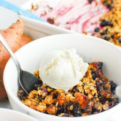 In a large mixing bowl, combine the roasted sweetpotatoes, blueberries, coconut sugar, corn starch, lemon juice, vanilla, cinnamon, and salt. Pour into the prepared baking dish.