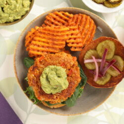 Once done, pile a lightly toasted bun high with greens, patty and top it off with a generous helping of guac and dig in!