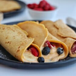 Spoon a few dollops of the filling into the center of each crepe, add some fruit, and roll up.