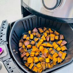Cook sweetpotato cubes in the air-fryer for 12-15 minutes, shaking once midway, until the cubes are golden and crisp.