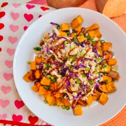 Divide roasted sweetpotatoes among 4 bowls. Top with the chicken and veggie mixture. Garnish with green onions and drizzle with sriracha.