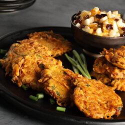 Sweetpotato Fritters with Pear Coulis feature crispy pan-fried fritters made from shredded sweetpotatoes, eggs, green onions, and warm spices. Served with a sweet pear coulis blended with raisins, orange marmalade, and ginger, this dish balances savory fritters with a bright, fruity topping.