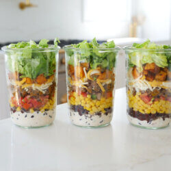 Assemble three meal prep jars with dressing at the bottom, followed by black beans, corn, pico de gallo, the cooked beef, cheese, sweetpotato, and romaine.