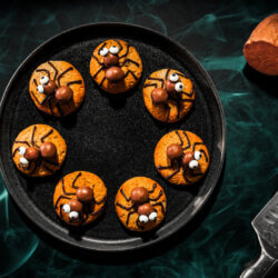 Using a small amount of warm melted dark chocolate, secure two Whoppers per cookie to form the spider’s body and head.
