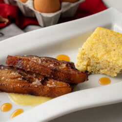 Coffee-Sorghum Belly : In an oven-proof, high sided pan, sear pork belly on stove until golden brown. Add coffee and ¼ c sorghum, cover tightly with a lid (or foil), and braise in a 250 degree oven until tender, around 2.5-3 hours. Remove belly from liquid and on to a sheet tray. Cover with a piece of parchment paper, place another tray over and top with a weight (a large can of food works well). Allow to press overnight in a fridge. Slice belly into 1 inch pieces and lay on a sheet tray. Melt together remaining ¼ c sorghum and butter and brush belly pieces with glaze. Bake in a 400 degree oven for 5-10 minutes, until belly is starting to crisp and is well glazed. Sprinkle with smoked salt.