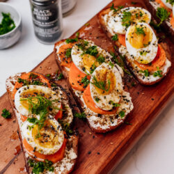 Top with a halved 6 minute egg. Finish with all the herb and seasonings, generously sprinkling on each
