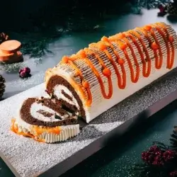 A delightful Sweetpotato Yule Log, combining rich chocolate sponge and creamy vanilla filling, elegantly finished with sweetpotato icing for a festive and unique dessert.